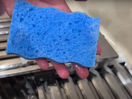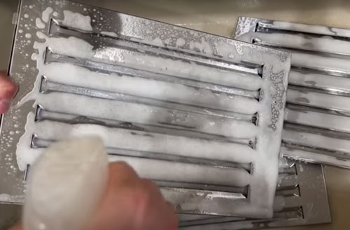 Después de haber empapado los filtros en agua caliente y detergente desengrasante, frota suavemente las superficies con una esponja o cepillo de cerdas suaves para eliminar la grasa y la suciedad acumuladas. Enjuaga los filtros con agua caliente y sécalos completamente antes de volver a colocarlos en la campana.