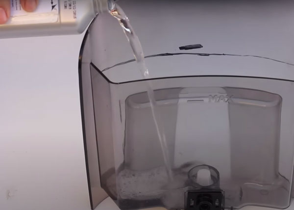 Llena el depósito de agua de la cafetera con la solución descalcificadora preparada.