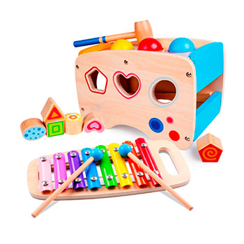 El siguiente juguete es un instrumento de percusión que cuenta con un xilófono, 3 bolas, 1 martillo, 6 bloques de construcción, 1 oxófono y 2 palillos. El combo educativo perfecto para cultivar interés en la música a tus hijos, inspirarlos, desarrollar habilidades, la creatividad, imaginación y mucho más mientras se divierten.